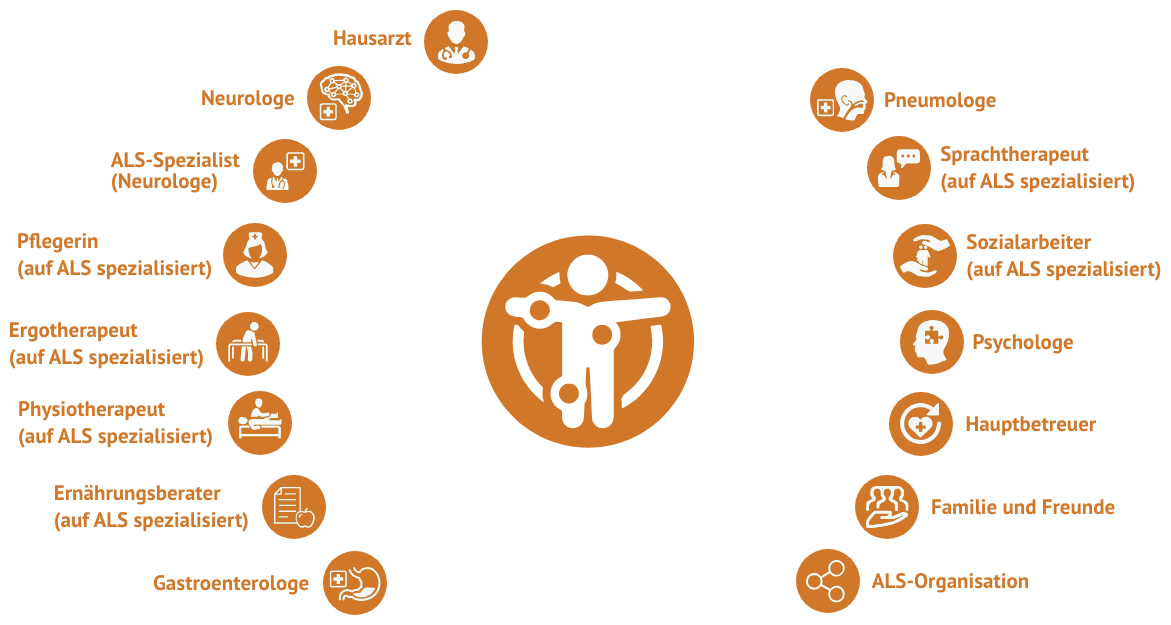 Entsprechend der Empfehlungen der ALS-Gesellschaft ist es hilfreich, eng mit vielen dieser Gesundheitsdienstleister zusammenzuarbeiten: